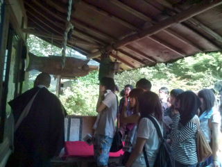 千光寺の住職さんに角倉了以翁の御話をして頂き、真剣に聞き入る学生さん。