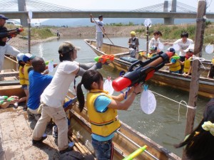 保津川下りの船に乗り込み、互いに水てっぽうを使っての大バトル!!