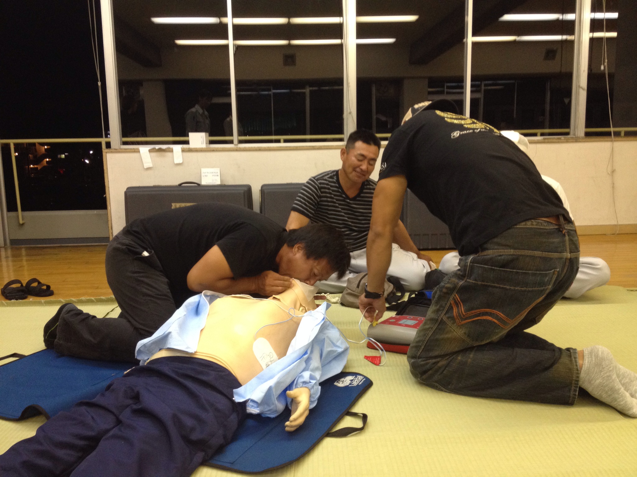 人が倒れている状況に直面したと想定して、人形を相手に心臓マッサージ(胸骨圧迫)を行ったり人工呼吸、AEDを使用!!!
