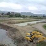ショベルカーのキャタピラー部分を川に浸からせながら砂利をかき土手を築く、オペレーターさんが手先で器用にレバーを操作し…