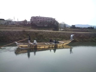 上の写真は、午前中仕事が終わった船頭達が、 新人船頭の竿さし指導の為、