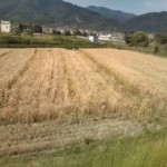 今、JR亀岡駅北口一帯で二条大麦の収穫がピークを迎えています。