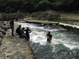 激流の底に潜む岩に、ロープ1本で近づき、ワイヤーを岩に巻き付けて、引き揚げます。
